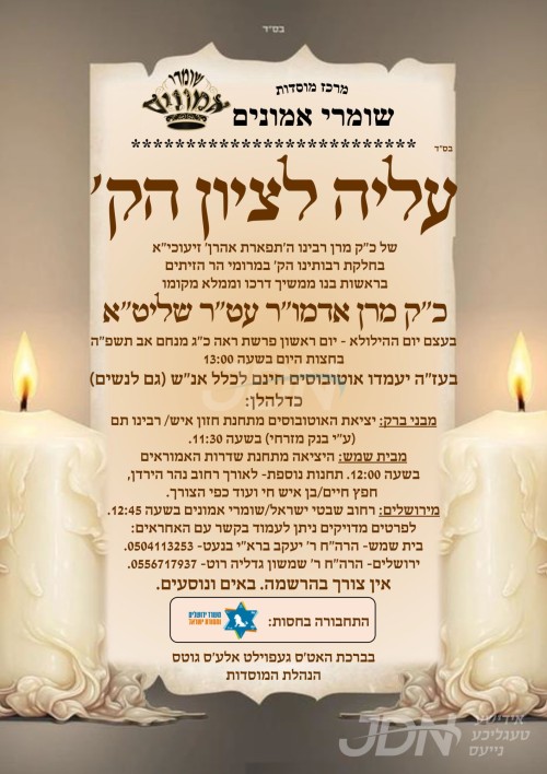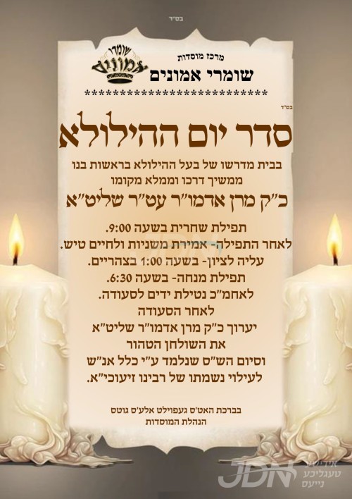 היינט כ"ג אב געפאלט די יומא דהילולא קדישא פון כ"ק אדמו"ר משומרי אמונים זצ"ל בעל תפארת אהרן, בנו ממלא מקומו כ"ק אדמו"ר משומרי אמונים שליט"א וועט ארויפגיין צום ציון הק' אין די מיטאג שעה'ן בראש קהל חסידיו, און שפעטער פארנאכטס אפרעכטן די יארצייט טיש און סיום הש"ס אין ביהמ"ד שומרי אמונים אין בני ברק.