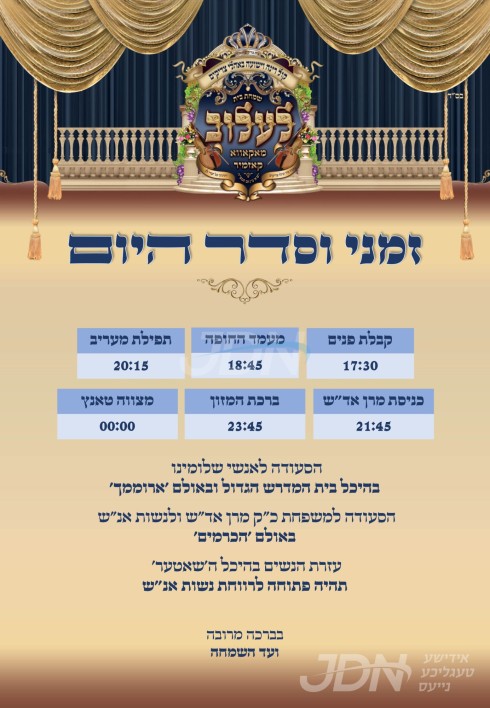 שמחת בית דעעש – לויעוו טשערנאביל: היינט קומט פאר די שמחת התנאים פון א אייניקל ביי כ"ק אדמו"ר מדעעש שליט"א, די חתן א זון פון זיין זון הגה"צ ר' מרדכי פאנעט שליט"א, איידעם ביי כ"ק אדמו"ר מלויעוו טשערנאביל שליט"א, מיט די כלה א טאכטער פון הגה"צ ר' שלמה לייפער שליט"א, זון פון כ"ק אדמו"ר מטעמעשוואר ירושלים זצ"ל, און איידעם ביי הגה"צ ר' משה טובי' גרינצווייג זצ"ל. – די שמחה קומט פאר אין זאל פון ת"ת סאטמאר אויף מאנסי באלערוואד אין מאנסי.