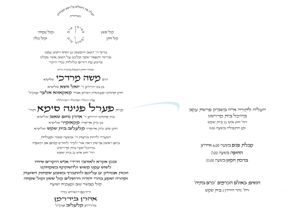 שמחת בית לעלוב – קוזמיר: היינט קומט פאר די שמחת החתונה פון א אייניקל ביי כ"ק אדמו"ר מלעלוב שליט"א, די חתן א זון פון בנו הגדול הגה"צ ר' יואל זושא בידערמאן שליט"א, איידעם ביי הגה"צ אבד"ק מאקאווא אלעד זצ"ל, מיט די כלה א טאכטער פון הגה"צ ר' אהרן נחום טאוב שליט"א, זון פון כ"ק אדמו"ר מקוזמיר שליט"א, און איידעם ביי כ"ק אדמו"ר מלעלוב בית שמש שליט"א. – די שמחת החתונה קומט פאר אין ביהמ"ד הגדול לעלוב אין בית שמש.