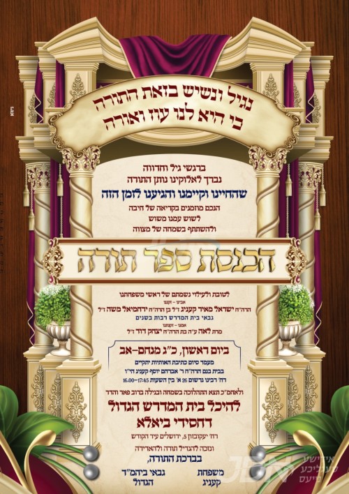 היינט קומט פאר די מעמד הכנסת ספר תורה וואס ווערט אריינגעגעבן צום ביהמ"ד הגדול ביאלא אויף רחוב יעקובזון אין ירושלים, לע"נ הרב החסיד ר' ישראל מאיר קעניג ע"ה גבאי ביהמ"ד הגדול ביאלא, אין שפיץ פון כ"ק אדמו"ר מביאלא שליט"א.