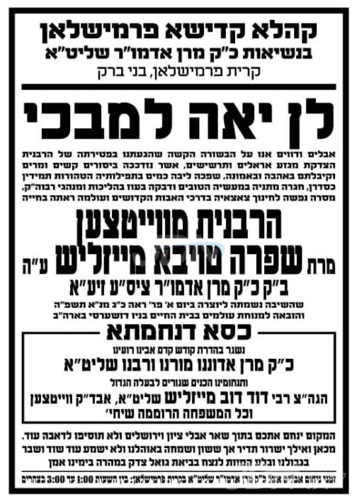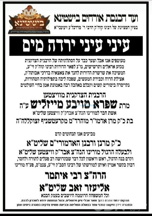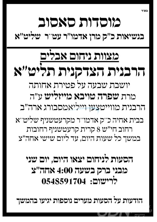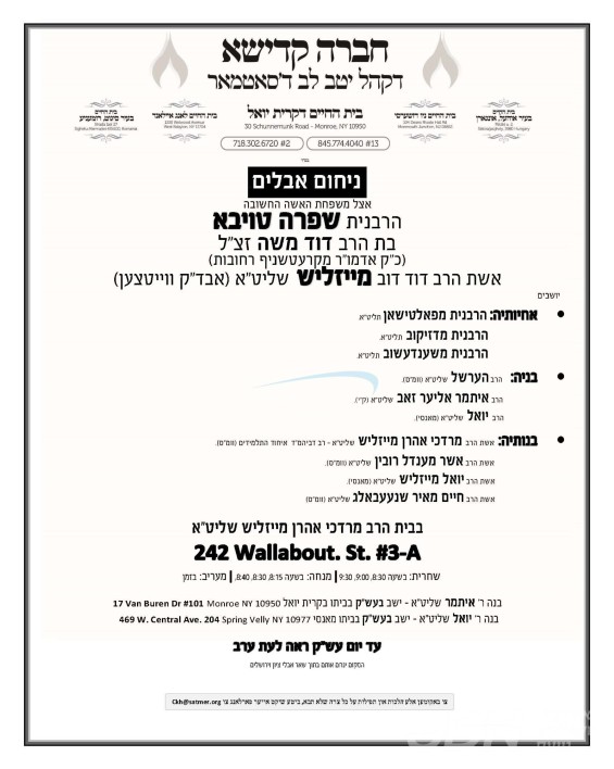 צו די פטירה פון הרבנית מווייטצען ע"ה, אשת חבר הגה"צ רבי דוד דוב מייזליש שליט"א אבד"ק ווייטצען וומס"ב, און טאכטער פון כ"ק אדמו"ר הרה"ק רבי דוד משה מקרעטשניף זי"ע, זיצן שבעה די בני המשפחה אין שטוב פונעם איידעם הגה"צ ר' מרדכי אהרן מייזליש שליט"א רב ביהמ"ד איחוד התלמידים ד'סאטמאר אין וויליאמסבורג.