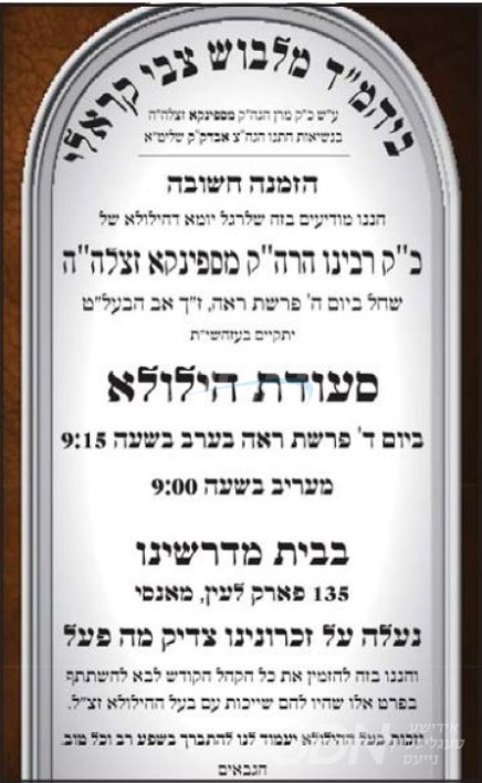 חתנו הגה"צ אב"ד קראלי מאנסי שליט"א וועט אפרעכטן די יארצייט סעודה היינט נאכט בבית מדרשו אין מאנסי.
