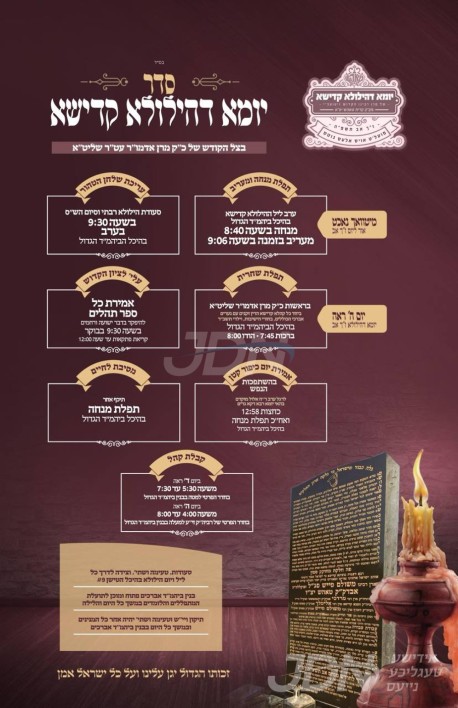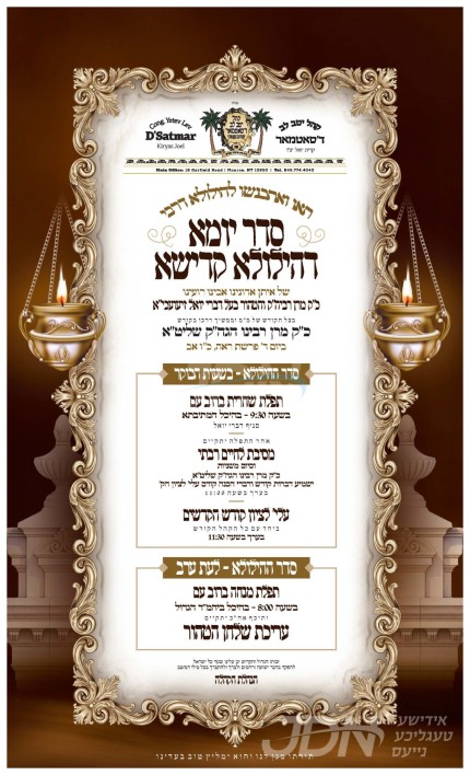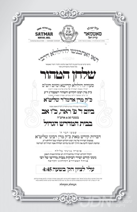 היינט כ"ו אב ביומא דהילולא קדישא פון כ"ק אדמו"ר הרה"ק מסאטמאר זי"ע, וועט ממשיך דרכו בקודש כ"ק אדמו"ר מסאטמאר שליט"א ארויפגיין צום ציון הק' אין קרית יואל ארום פיר אזייגער נאכמיטאג, און שפעטער פארנאכטס אפרעכטן די צענטראלע יארצייט טיש און סיום הש"ס אינעם גרויסן היכל אלטר יחזקאל בבנין ביהמ"ד בנין אליהו סאטמאר אין קרית יואל.