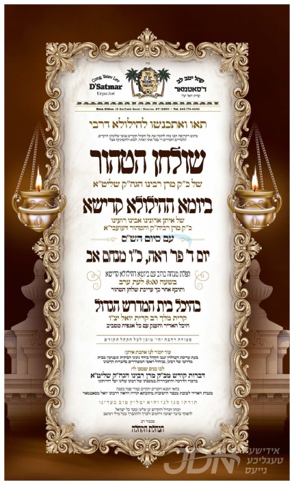 היינט כ"ו אב ביומא דהילולא קדישא פון כ"ק אדמו"ר הרה"ק מסאטמאר זי"ע, וועט ממשיך דרכו בקודש כ"ק אדמו"ר מסאטמאר שליט"א ארויפגיין צום ציון הק' אין קרית יואל אין די מיטאג שעה'ן, און שפעטער פארנאכטס אפרעכטן די צענטראלע יארצייט טיש און סיום הש"ס אין ביהמ"ד הגדול אין קרית יואל אינאיינעם מיט די יערליכע דינער לטובת די ישיבה ומתיבתא תורה ויראה ד'סאטמאר.