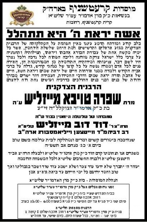 דער ברודער כ"ק אדמו"ר מקרעטשניף שליט"א זיצט שבעה בביתו נאוה קודש אין קרית קרעטשניף רחובות, אזוי אויך זיצט דארט די שוועסטער הרבנית מסאסוב תליט"א, אשת חבר כ"ק אדמו"ר מסאסוב שליט"א.