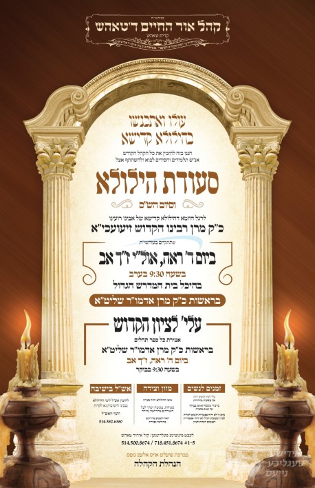 היינט פארנאכטס וועט פארקומען א באזונדערע סעודת הילולא פאר די הונדערטער תלמידי הישיבות דחסידי טאהש, אין זאל פון בית צירל אין קרית טאהש, אין שפיץ פון כ"ק אדמו"ר מטאהש שליט"א וועלכער וועט משמיע זיין דברי ברכה והדרכה.