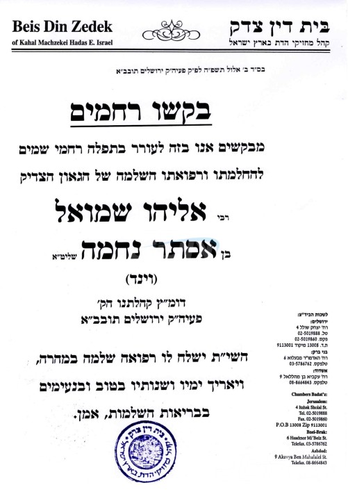 מטעם בית דין צדק שע"י קהל מחזיקי הדת דחסידי בעלזא, איז ארויסגעשטעלט געווארן א מודעה פאר כל הקהל הקודש חסידי בעלזא, צו מתפלל זיין און מעורר זיין רחמי שמים לרפואת הגאון הגדול רבי אליהו שמואל ווינד שליט"א דומ"ץ בעלזא אין ירושלים, וועלכער געפונט זיך אין א שווערע געזונט צושטאנד.