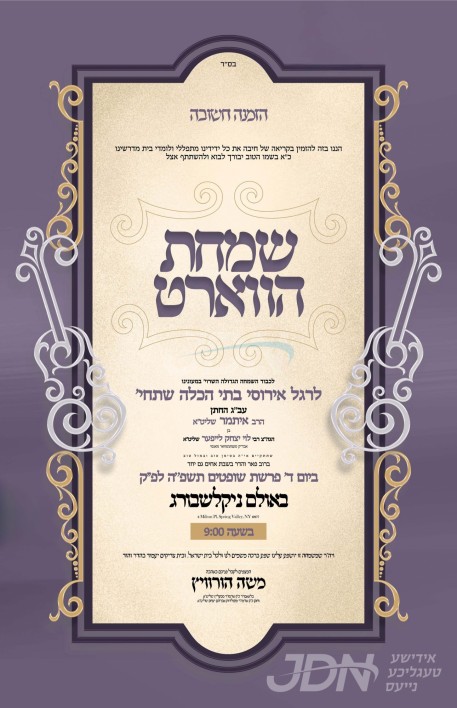 היינט קומט פאר די שמחת החתונה פונעם חתן א זון פון הרב שלום יחזקאל וויינבערגער שליט"א, זון פון הגה"צ ר' שמעון יואל וויינבערגער שליט"א גאב"ד וויטקא, און איידעם ביי הגה"צ ר' יצחק אהרן פילאפף שליט"א, איידעם ביי כ"ק אדמו"ר מספינקא אנטווערפן שליט"א, מיט די כלה א טאכטער פון הרב מנחם בנציון זעגלבוים שליט"א, זון פון כ"ק אדמו"ר מוויען פלעטבוש זצ"ל, און איידעם ביי הגה"צ ר' יהושע ראזענבערגער שליט"א גאב"ד קרית הרמ"א בית שמש וחבר ביד"ץ העדה החרדית, חתן כלה אייניקלעך פון כ"ק אדמו"ר מספינקא ירושלים זצ"ל. – די שמחת החתונה קומט פאר אין זאל פארהאנד אין בית שמש.