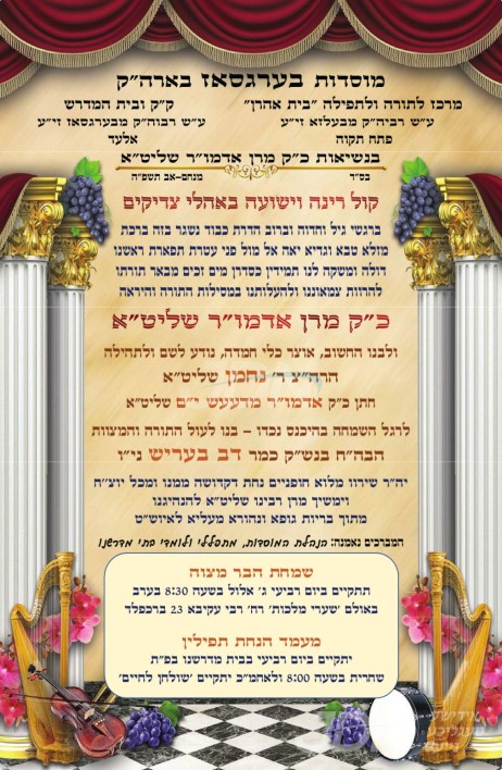 היינט קומט פאר די שמחת הבר מצוה פון א אייניקל ביי כ"ק אדמו"ר מבערעגסאז שליט"א, א זון פון זיין זון הרב נחמן פאללאק שליט"א, איידעם ביי כ"ק אדמו"ר מדעעש ירושלים שליט"א. – די שמחה קומט פאר אין זאל שערי מלכות אין מודיעין עילית.