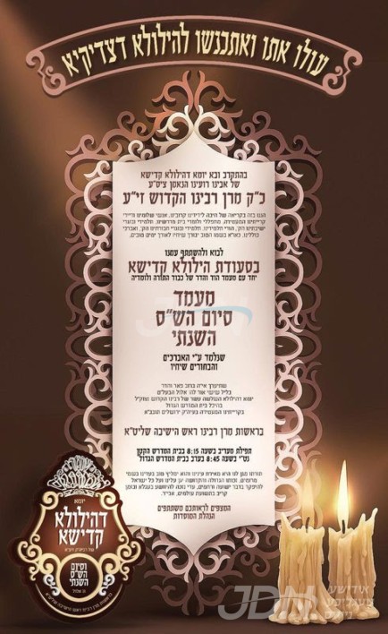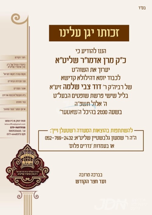 כ"ק אדמו"ר מבאסטאן ביתר שליט"א וועט היינט אויפדערנאכט אפרעכטן די יארצייט טיש לרגל די יומא דהילולא קדישא פונעם פעטער הרה"ק רבי דוד צבי שלמה מלעלוב זי"ע, בבית מדרשו אין ביתר עילית.