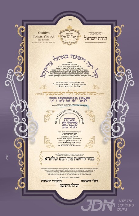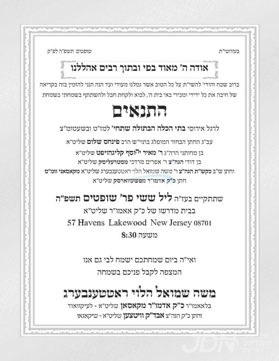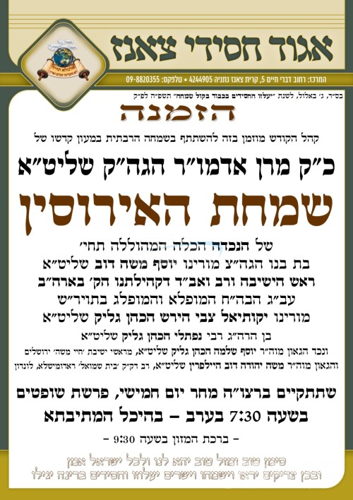 עס איז געשלאסן געווארן די שידוך פונעם חתן א זון פון הגה"צ ר' שאול יחזקאל כהנא שליט"א, זון פון הגה"צ ר' יצחק אייזיק כהנא שליט"א דיין אין די עדה החרדית, און איידעם ביי הגה"צ ר' משה זאב זארגער שליט"א דומ"ץ סאטמאר ירושלים, מיט די כלה א טאכטער פון הגה"צ ר' יואל פאללאק שליט"א דומ"ץ תולדות אהרן לאנדאן, זון פון הגה"צ אבד"ק נאנאש וומס"ב שליט"א, און איידעם ביי הגה"צ ר' בעריש מייזליש שליט"א מווייטצען לאנדאן.