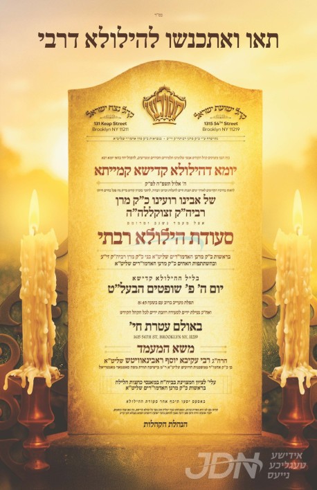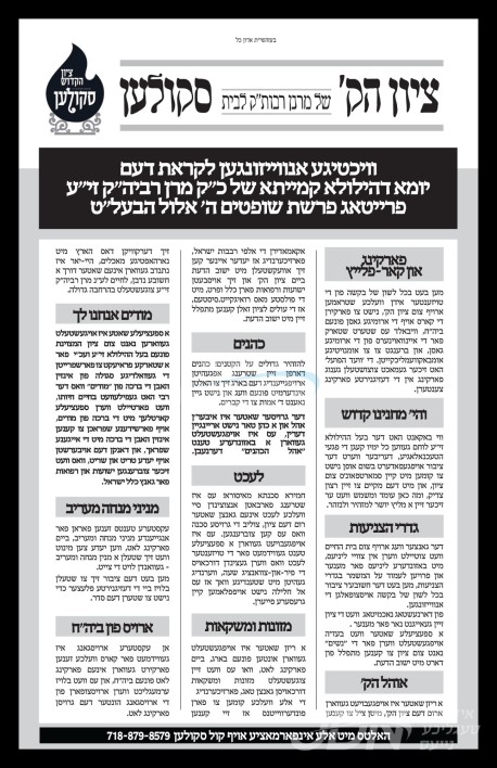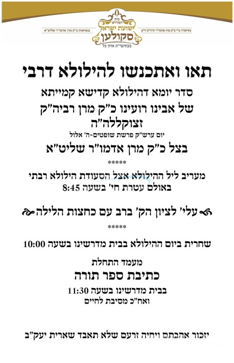 היינט נאכט ה' אלול געפאלט די ערשטע הילולא קדישא פון כ"ק אדמו"ר הרה"ק מסקולען זצ"ל, די צענטראלע יארצייט טיש און סיום הש"ס וועט פארקומען היינט נאכט אין זאל עטרת חי' אין בארא פארק, אין שפיץ פון בניו ממשיכי דרכו כ"ק האדמורי"ם שליט"א, מיט די באטייליגונג פון די ברידער כ"ק האדמורי"ם שליט"א. נאכן יארצייט טיש וועט מען ארויספארן קיין מאנסי צו פוקד זיין דעם ציון הק' אויפן וויזניצע בית החיים, און מארגן ערב שבת קודש וועט פארקומען די מעמד התחלת כתיבת ספר תורה לזכרו הטהור, אין ביהמ"ד סקולען אין בארא פארק.