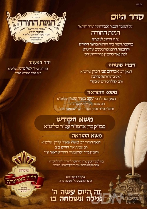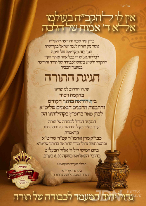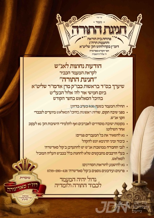 היינט קומט פאר די מעמד חגיגת התורה בחצר הקודש סאדיגורא, צום הרחבת גבולי ההוראה מיטן גרינדונג פון די בית הוראה, און דאס אויפנעמען נייע דיינים אין די קהילות הקודש דחסידי סאדיגורא אין ארץ ישראל, די מעמד קומט פאר אין גרויסן סאלאש נעבן ביהמ"ד הגדול סאדיגורא אין בני ברק, אין שפיץ פון כ"ק אדמו"ר מסאדיגורא שליט"א.