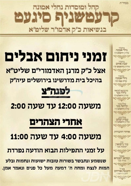 כ"ק אדמו"ר מקרעטשניף שליט"א פון ירושלים זיצט שבעה בבית מדרשו אויף רחוב אבינועם ילין אין ירושלים.