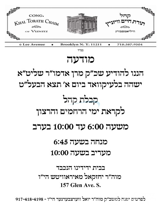 כ"ק אדמו"ר מוויזניץ שליט"א פון וויליאמסבורג קומט היינט אן קיין לעיקוואד, אויפצונעמען דעם ציבור חסידים לקראת די הייליגע טעג, אין שטוב פון הנגיד החסיד ר' יחזקאל מאיראוויטש הי"ו.