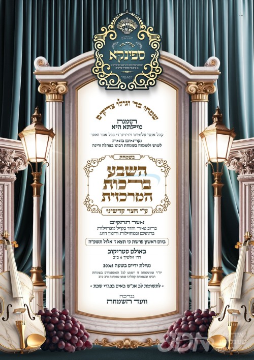 שמחת בית ספינקא: היינט קומט פאר די שמחת השבע ברכות פון די חתן א זון פון כ"ק אדמו"ר מספינקא רמת אהרן שליט"א, מיט די כלה א טאכטער פון הרה"ג ר' נחמן ראזנער שליט"א אב"ד ראשית חכמה ירושלים. – די שמחת השבע ברכות קומט פאר אין די סטריקובע זאל אויף רחוב אלשיך אין בני ברק.