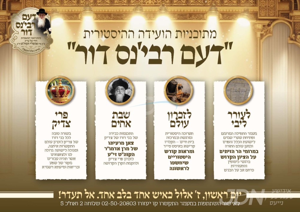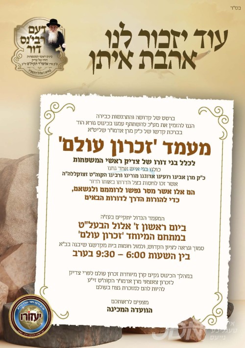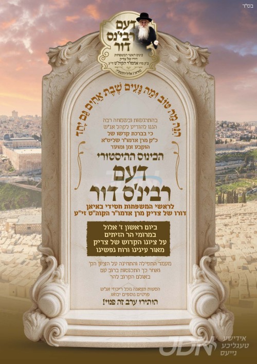 היינט קומט פאר א ספעציעלע כינוס פאר די זקני החסידים בחצר הקודש באיאן "דעם רבינ'ס דור", אנגעהויבן מיטן מעמד עלי' לציון פון כ"ק אדמו"ר מבאיאן זצ"ל, נאכגעפאלגט מיט א פראכטפולע מעמד זכרון עולם נישט ווייט פון די הר הזיתים אין ירושלים.