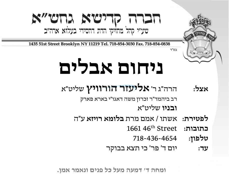 צו די פטירה פון הרבנית בת קדושים מרת בלומא רויזא הורוויץ ע"ה, אשת חבר הגה"צ ר' אלטר אליעזר הורוויץ שליט"א אבד"ק אגודת ישראל זכרון משה אין בארא פארק, זיצן שבעה די בני המשפחה, איר מאן דער רב שליט"א, די קינדער הרבנים, און די ברידער הגה"צ רבי דוד שלמה כ"ץ שליט"א אבד"ק בית אהרן פלעטבוש, הגה"צ רבי יהושע כ"ץ שליט"א אבד"ק מאגרוב, הגה"צ רבי יונתן בנימין כ"ץ שליט"א אבד"ק פאלטישאן סקווירא פלעטבוש, און די שוועסטערס הרבנית מחוסט תליט"א, אשת חבר כ"ק אדמו"ר מחוסט שליט"א פון בארא פארק, און אשת הגה"צ ר' אברהם מרדכי רובין שליט"א, אין איר שטוב אויף די זעקס און פערציגסטע סטריט אין בארא פארק.
