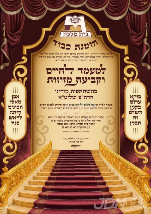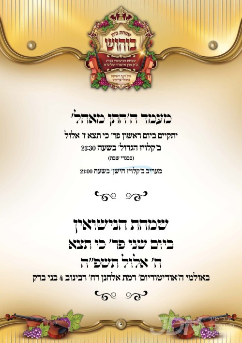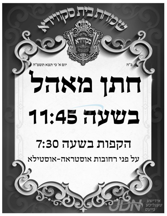 שמחת בית קאמארנא: היינט קומט פאר די שמחת החתונה פון א אייניקל ביי כ"ק אדמו"ר מקאמארנא שליט"א, די כלה א טאכטער פון זיין זון הגה"צ ר' יהודה ארי' סאפרין שליט"א ראש כולל קאמארנא, מיט די חתן א זון פון הגה"צ ר' אהרן שטערן שליט"א, זון פון הגה"צ גאב"ד ביליץ ב"ב שליט"א, און איידעם ביי הגה"צ ר' אשר אנשיל קליין זצ"ל גאב"ד וואשארהעלי. – די שמחת החתונה קומט פאר אין זאל גאלדען סקיי אין שטאט ביתר.
