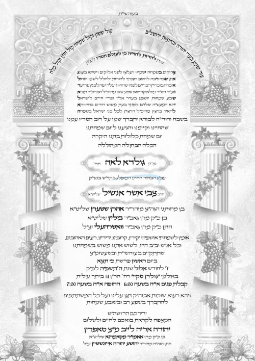 היינט קומט פאר די שמחת החתונה פונעם חתן א זון פון הגה"צ ר' אהרן יעקב כהנא שליט"א, זון פון הגה"צ ר' אלימלך כהנא זצ"ל מספינקא ב"ב, און איידעם ביי הגה"צ ר' יחיאל וואגשאהל שליט"א אבד"ק תפארת משה, מיט די כלה א טאכטער פון הגה"צ ר' אברהם שמשון הורוויץ שליט"א, זון פון הגה"צ ר' יוסף טובי' הורוויץ שליט"א אב"ד ליטאוויסק, און איידעם ביי הגה"צ ר' אהרן זאב מאליק זצ"ל אדמו"ר מסאמבור. – די שמחת החתונה קומט פאר אין זאל גינת קליין אין קרית יואל.