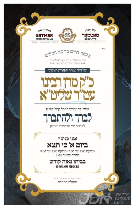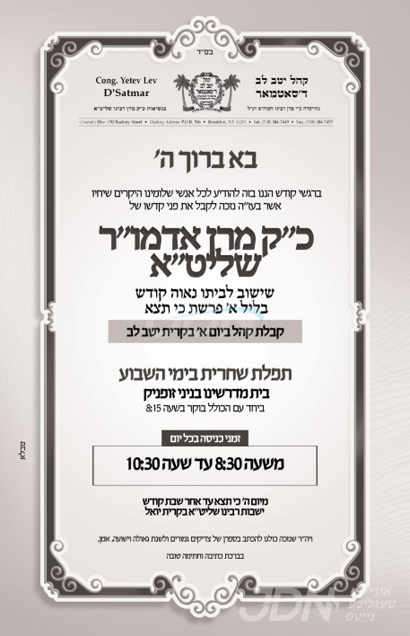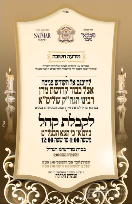 כ"ק אדמו"ר מסאטמאר שליט"א קומט היינט אן קיין מאנסי אויפצונעמען די חסידים לקראת די הייליגע טעג, אין ביהמ"ד דקהל יטב לב ד'סאטמאר אויף מאנסי באלערוואד.