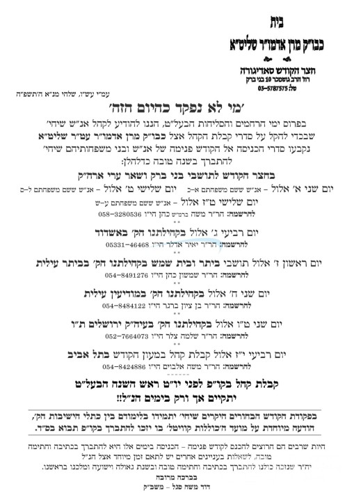 כ"ק אדמו"ר מצאנז שליט"א קומט היינט אן קיין ביתר, אויפצונעמען דעם ציבור חסידים לקראת די הייליגע טעג הממשמשים ובאים, בבית מדרשו אויף רחוב פנים מאירים.