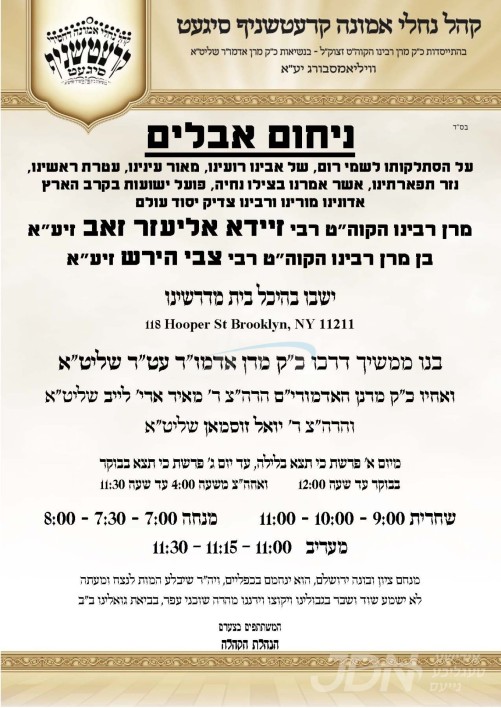 די קינדער האדמורי"ם וואס וואוינען אין אמעריקע, וועלן זיצן שבעה פון היינט זונטאג נאכט אין ביהמ"ד קרעטשניף סיגעט אויף הופפער סטריט אין וויליאמסבורג, ביז דעם קומענדיגן דינסטאג אינדערפרי.