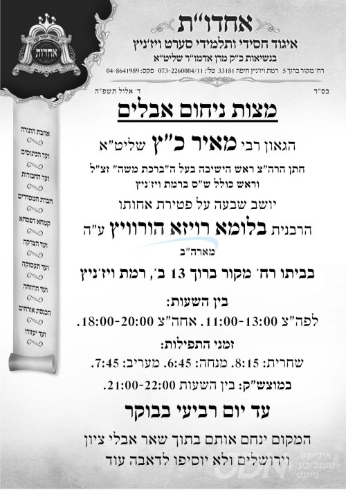 דער ברודער הגה"צ רבי מאיר כ"ץ שליט"א ראש כולל ש"ס אין רמת וויזניץ חיפה, זיצט שבעה אין זיין שטוב אויף רחוב מקור ברוך אין רמת וויזניץ חיפה.