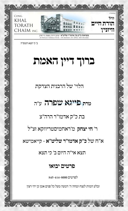 מיט גרויס צער און טרויער ווערט אויפגענומען יעצט אינדערפרי די ביטערע בשורה, איבער די פטירה פון הרבנית הצדיקת מוויזניץ ע"ה, אשת חבר כ"ק אדמו"ר מוויזניץ שליט"א פון קייאמישע, און ברתא דמלכא קדישא פון כ"ק אדמו"ר הרה"ק מראחמיסטריווקא זי"ע, אין עלטער פון 70 יאר.