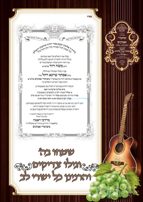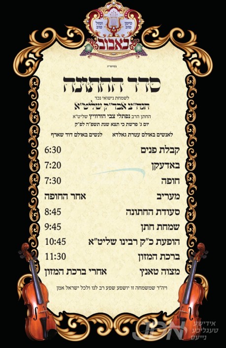 היינט קומט פאר די שמחת החתונה פונעם חתן א זון פון הגה"צ ר' אליעזר שמעון הורוויץ שליט"א אבד"ק דזיקוב ב"פ, איידעם ביי הגה"צ אבד"ק באבוב 45 שליט"א, מיט די כלה א טאכטער פון הגה"צ ר' אלטר זאב פרענקל שליט"א, זון פון כ"ק אדמו"ר מוויעליפאלי שליט"א, און איידעם ביי הגה"צ ר' אלישע סעקולא שליט"א אבד"ק סאדאוונא, איידעם ביי כ"ק אדמו"ר מסטריזוב שליט"א. – די שמחת החתונה קומט פאר אין זאל עטרת גאלדא אין בארא פארק.