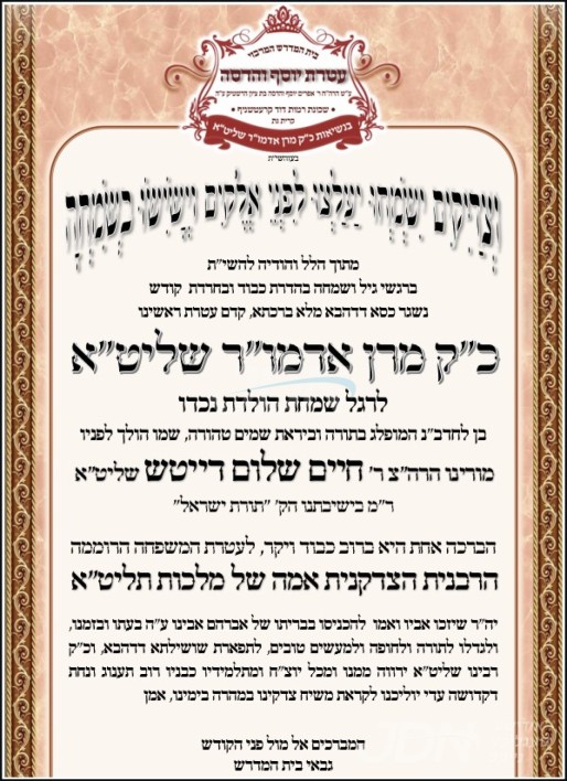 היינט קומט פאר די שמחת הברית פון א אייניקל ביי כ"ק אדמו"ר מקרעטשניף קרית גת שליט"א, בן הנולד ביי זיין איידעם הרב חיים שלום דייטש שליט"א, זון פון הגה"צ ר' מתתיהו דייטש שליט"א גאב"ד רמת שלמה. – די שמחה קומט פאר אין ביהמ"ד קרעטשניף אין קרית גת.