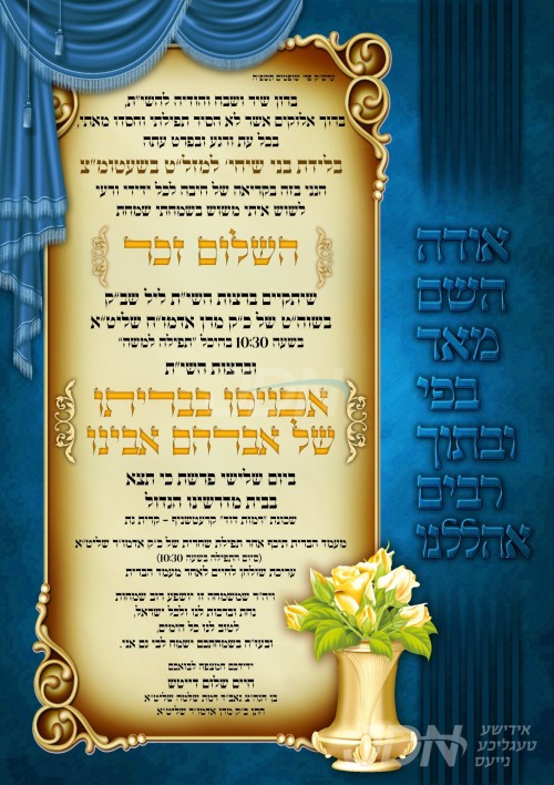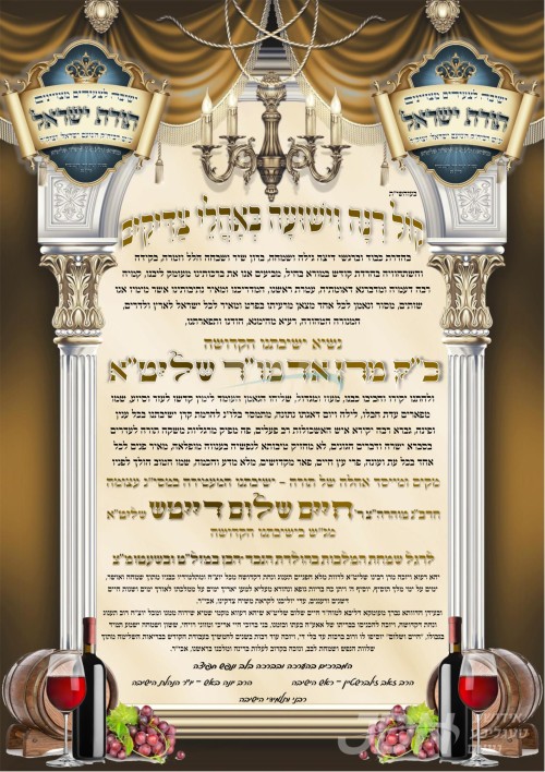 היינט קומט פאר די שמחת הברית פונעם ערשטן אור אייניקל ביי כ"ק אדמו"ר משאץ שליט"א פון מאנסי, אייניקל פון בנו הגדול הגה"צ ר' ישראל מאסקאוויטש שליט"א ראש ישיבת אמרי חיים וויזניץ אין נייעק, איידעם ביי כ"ק אדמו"ר מוויזניץ שליט"א פון ירושלים, בן הנולד ביי זיין איידעם הרב פנחס טירנויער שליט"א, זון פון הגה"צ ר' חיים טירנויער שליט"א ר"ם בישיבת ווילרייק, זון פון הגה"צ רבי יצחק אייזיק טירנויער שליט"א אבד"ק שומרי שבת, און איידעם ביי הגה"צ ר' חיים יוסף דוד ווייס שליט"א דומ"ץ סאטמאר אנטווערפן. – די שמחה קומט פאר אין ביהמ"ד דעת שלום שאץ אין מאנסי.