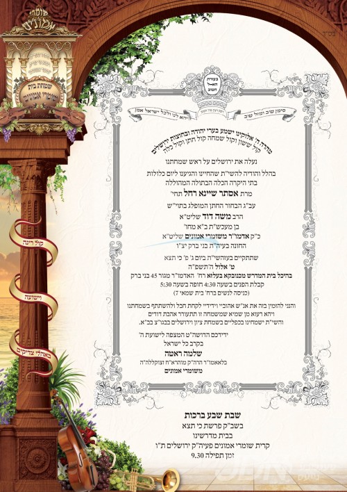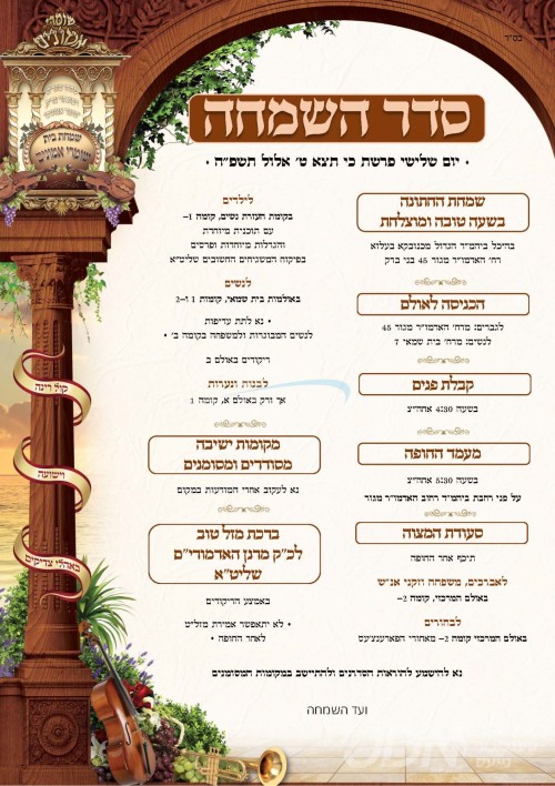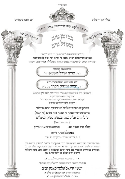 היינט קומט פאר די שמחת החתונה פונעם חתן א זון פון הגה"צ ר' יוסף כ"ץ שליט"א אבד"ק דושינסקיא וומס"ב, איידעם ביי כ"ק אדמו"ר מחוסט שליט"א פון ב"פ, מיט די כלה א טאכטער פון הגה"צ ר' ישעי' יחיאל אלטר לאבין שליט"א, זון פון כ"ק אדמו"ר מבאלחוב שליט"א, און איידעם ביי כ"ק אדמו"ר מבורשטין שליט"א. – די שמחת החתונה קומט פאר אין זאל כתר ריזל אין וויליאמסבורג.