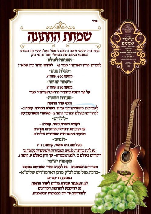 שמחת בית שומרי אמונים: היינט קומט פאר די שמחת החתונה פונעם חתן א זון פון כ"ק אדמו"ר משומרי אמונים שליט"א פון בני ברק, איידעם ביי הגה"צ ר' יהודה יחיאל שיינפעלד שליט"א מטאלטשאווא, מיט די כלה א טאכטער פון כ"ק אדמו"ר משומרי אמונים שליט"א פון ירושלים, איידעם ביי כ"ק אדמו"ר מהאלמין שליט"א. – די שמחת החתונה קומט פאר אין ביהמ"ד הגדול מאחנובקא בעלזא אין בני ברק.