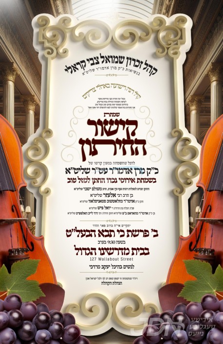 שמחת בית קראלי – מעזבוזש – זלאטשוב סטאניסלאוו: היינט קומט פאר די שמחת התנאים פון א אייניקל ביי כ"ק אדמו"ר מקראלי שליט"א, די חתן א זון פון זיין זון הגה"צ ר' אלעזר הורוויץ שליט"א, איידעם ביי הגה"צ ר' צבי נחום אשכנזי שליט"א אדמו"ר מזלאטשוב סטאניסלאוו, איידעם ביי הגה"צ גאב"ד מעזבוזש שליט"א, מיט די כלה א טאכטער פון הרב יואל פיש שליט"א, זון פון הגה"צ ר' ישראל פיש שליט"א אבד"ק האדאס ב"פ. – די שמחה קומט פאר אין קראלי ביהמ"ד אין וויליאמסבורג.
