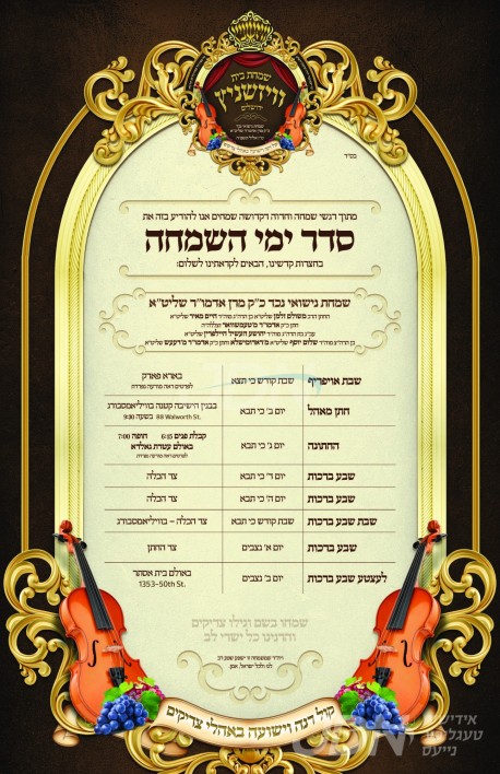 שמחת בית סקווירא – זוועהיל – ראחמיסטריווקא: היינט קומט פאר די שמחת התנאים פון א אור אייניקל ביי כ"ק אדמו"ר מסקווירא שליט"א, עלטסטע אייניקל פון כ"ק אדמו"ר מזוועהיל ארה"ב שליט"א, די חתן א זון פון זיין זון הגה"צ ר' פנחס אהרן גאלדמאן שליט"א, איידעם ביי הגה"צ אבד"ק אוהעל מאנסי שליט"א, מיט די כלה א טאכטער פון הגה"צ ר' מנחם נחום טווערסקי שליט"א, זון פון הגה"צ ר' יהושע העשיל טווערסקי זצ"ל מראחמיסטריווקא, און איידעם ביי כ"ק אדמו"ר מראחמיסטריווקא זצ"ל. – די שמחה קומט פאר אין ביהמ"ד הגדול ראחמיסטריווקא אין בארא פארק.