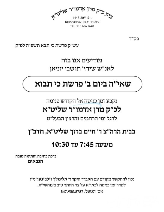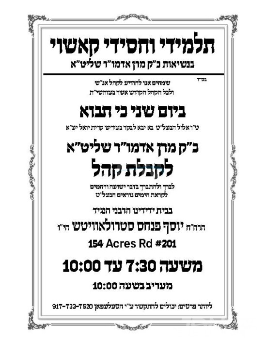 כ"ק אדמו"ר מקאשוי שליט"א קומט היינט אן קיין קרית יואל אויפצונעמען די חסידים לקראת די הייליגע טעג, אין שטוב פון הנגיד החסיד ר' יוסף פנחס סטראלאוויטש הי"ו.