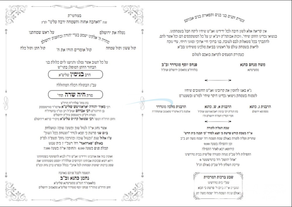 היינט קומט פאר די שמחת החתונה פונעם חתן א זון פון הרב נחמן כהנא שליט"א, זון פון כ"ק אדמו"ר מסערעדנא שליט"א פון בני ברק, און איידעם ביי כ"ק אדמו"ר מקאסוב ירושלים שליט"א, מיט די כלה א טאכטער פון הגה"צ ר' מאיר יודא יאראוויטש שליט"א אדמו"ר מוויטעבסק ירושלים. – די שמחת החתונה קומט פאר אין די פארהאנד זאל אין בית שמש.