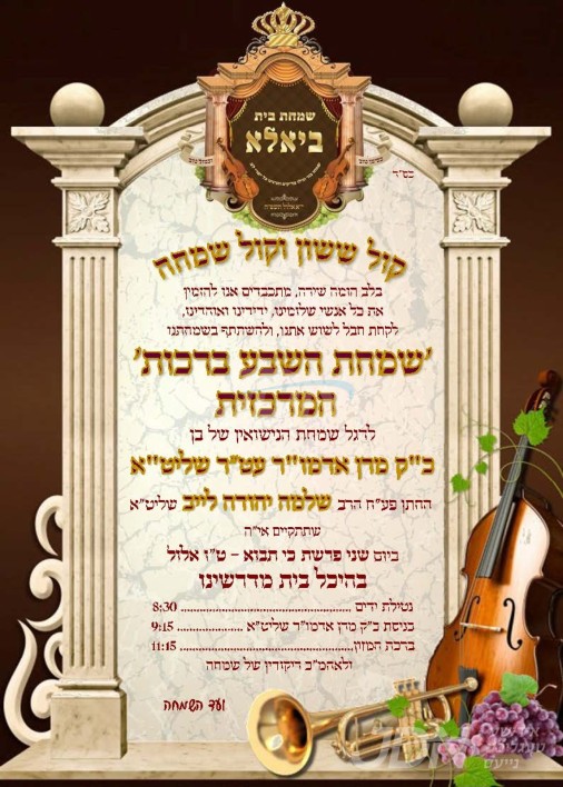 שמחת בית ביאלא בית שמש: היינט קומט פאר די שמחת השבע ברכות פונעם חתן א זון פון כ"ק אדמו"ר מביאלא בית שמש שליט"א, מיט די כלה א טאכטער פון הגה"צ ר' אהרן וואזנער שליט"א, זון פון הגה"צ גאב"ד זכרון מאיר זצ"ל בעל מחשבת הלוי, און איידעם ביי הגה"צ גאב"ד לאנדאן שליט"א. – די שמחת השבע ברכות קומט פאר אין ביהמ"ד ביאלא אין בית שמש.