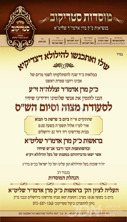 היינט נאכט ט"ז אלול געפאלט די יומא דהילולא קדישא פון כ"ק אדמו"ר מסטריקוב זצ"ל, חתנו כ"ק אדמו"ר מסטריקוב שליט"א וועט אפרעכטן די יארצייט טיש בבית מדרשו אין בני ברק, נכדו כ"ק אדמו"ר מסטריקוב ירושלים שליט"א וועט אפרעכטן די יארצייט טיש בבית מדרשו אין ירושלים.