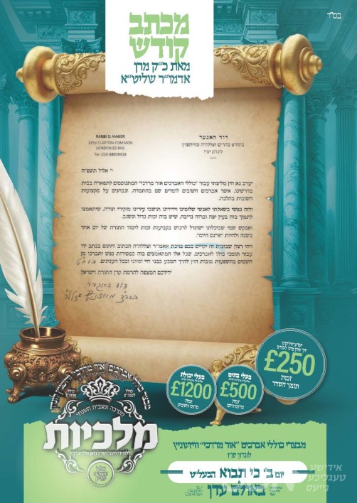 כ"ק אדמו"ר מנדבורנא ביתר שליט"א קומט היינט אן קיין בני ברק, אויפצונעמען קהל חסידיו מיט קוויטלעך לקראת די הייליגע טעג הממשמשים ובאים.
