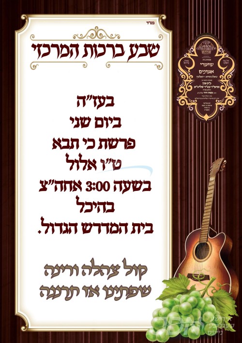 שמחת בית שומרי אמונים: היינט קומט פאר די שמחת השבע ברכות פונעם חתן א זון פון כ"ק אדמו"ר משומרי אמונים שליט"א פון בני ברק, איידעם ביי הגה"צ ר' יהודה יחיאל שיינפעלד שליט"א מטאלטשאווא, מיט די כלה א טאכטער פון כ"ק אדמו"ר משומרי אמונים שליט"א פון ירושלים, איידעם ביי כ"ק אדמו"ר מהאלמין שליט"א. – די שמחת השבע ברכות קומט פאר אין ביהמ"ד שומרי אמונים אין בני ברק.