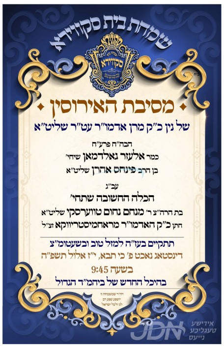 שמחת בית סקווירא – זוועהיל – ראחמיסטריווקא: היינט קומט פאר די שמחת האירוסין פון א אור אייניקל ביי כ"ק אדמו"ר מסקווירא שליט"א, עלטסטע אייניקל פון כ"ק אדמו"ר מזוועהיל ארה"ב שליט"א, די חתן א זון פון זיין זון הגה"צ ר' פנחס אהרן גאלדמאן שליט"א, איידעם ביי הגה"צ אבד"ק אוהעל מאנסי שליט"א, מיט די כלה א טאכטער פון הגה"צ ר' מנחם נחום טווערסקי שליט"א, זון פון הגה"צ ר' יהושע העשיל טווערסקי זצ"ל מראחמיסטריווקא, און איידעם ביי כ"ק אדמו"ר מראחמיסטריווקא זצ"ל. – די שמחה קומט פאר אין ביהמ"ד הגדול אין שיכון סקווירא.