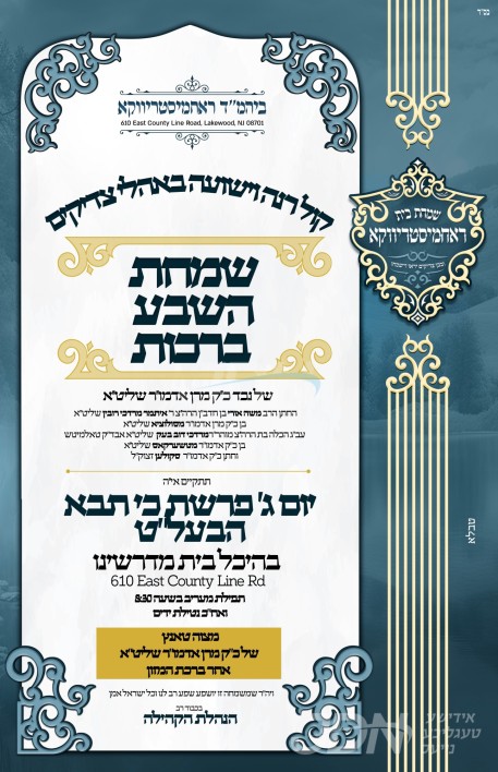 שמחת בית ראחמיסטריווקא: היינט קומט פאר די לעצטע שמחת השבע ברכות פון א אייניקל ביי כ"ק אדמו"ר מראחמיסטריווקא שליט"א פון לעיקוואד, די חתן א זון פון זיין איידעם הגה"צ ר' איתמר מרדכי דוד רובין שליט"א, זון פון כ"ק אדמו"ר מסוליצא שליט"א פון פאראקאוועי, מיט די כלה א טאכטער פון הגה"צ ר' מרדכי דוב בעק שליט"א אב"ד טאלמיטש, זון פון כ"ק אדמו"ר מטשערקאס שליט"א, און איידעם ביי כ"ק אדמו"ר מסקולען זצ"ל. – די שמחת השבע ברכות קומט פאר אין ראחמיסטריווקא בית המדרש אין לעיקוואד.