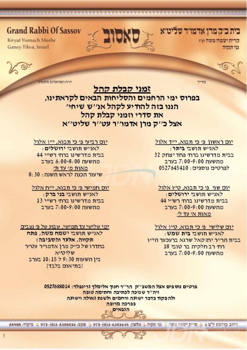 כ"ק אדמו"ר מסאסוב שליט"א קומט היינט אן קיין בית שמש אויפצונעמען די חסידים לקראת די הייליגע טעג, אין שטוב פון הרב יחזקאל שרגא ברעכער הי"ו.