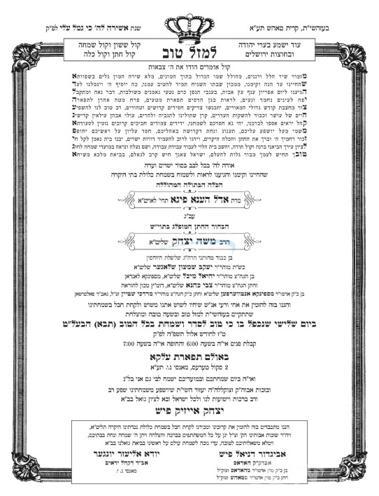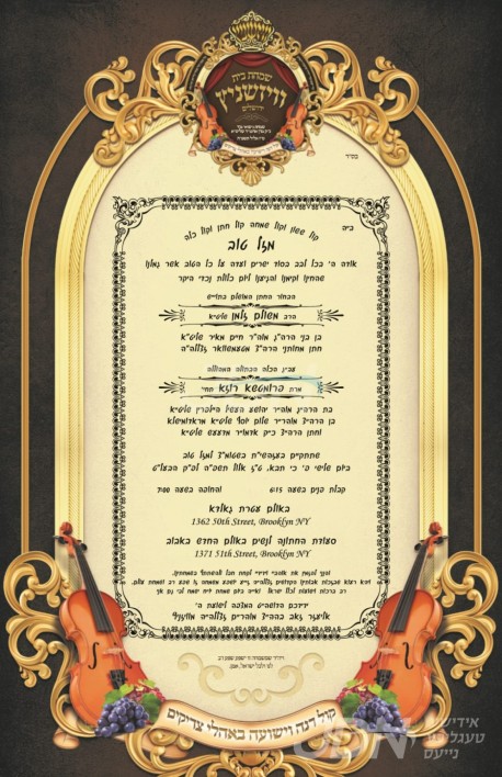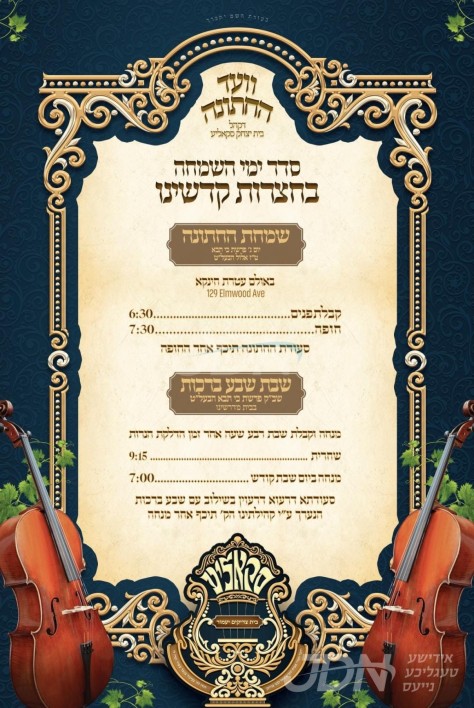 היינט קומט פאר די שמחת החתונה פונעם חתן א זון פון הרב יעקב שמעון שלאגער שליט"א, זון פון הגה"צ ר' יחיאל מיכל שלאגער שליט"א אבד"ק ספינקא לאנדאן, און איידעם ביי הגה"צ ר' הערשל כהנא שליט"א רב ביהמ"ד בית יעקב יצחק, זון פון כ"ק אדמו"ר מספינקא אנטווערפן שליט"א, און איידעם ביי הגה"צ גאב"ד פאלטישאן זצ"ל, מיט די כלה א טאכטער פון הגה"צ ר' יצחק אייזיק פיש שליט"א, זון פון כ"ק אדמו"ר מהאדאס שליט"א, און איידעם ביי הגה"צ ר' יודא אליעזר יונגער שליט"א אב"ד קהל יראים מאנסי. – די שמחת החתונה קומט פאר אין זאל תפארת עלקא אין מאנסי.