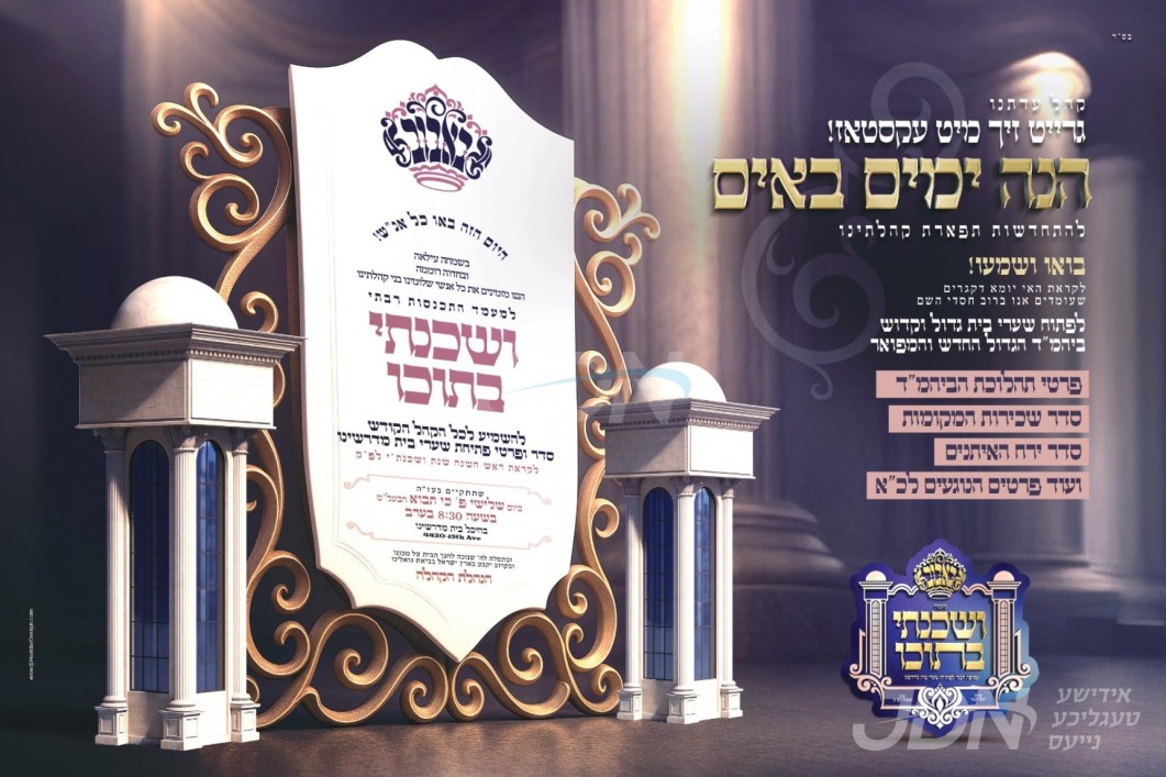 היינט קומט פאר די מעמד ושכנתי בתוכו בחצר הקודש באבוב 45, אין בעפארברייטונג צו די פתיחת שערים פון די נייע ביהמ"ד הגדול והחדש לקראת די ימים הנוראים הבעל"ט, די מעמד קומט פאר אינעם ביז יעצטיגן בנין ביהמ"ד אויף די פופצנטע עוועניו.