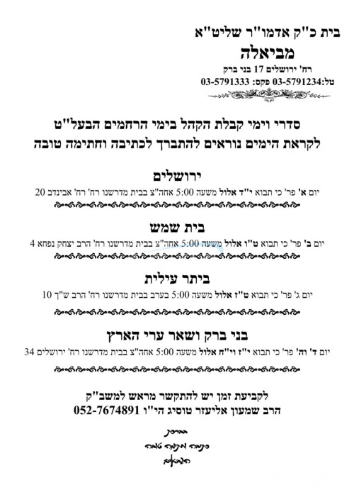 כ"ק אדמו"ר מביאלא בני ברק שליט"א קומט היינט אן קיין ביתר אויפצונעמען די חסידים לקראת די הייליגע טעג, בבית מדרשו אויף רחוב הרב שך.