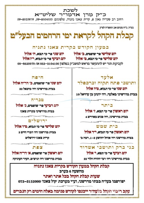 כ"ק אדמו"ר מצאנז שליט"א קומט היינט אן ירושלים עיה"ק, אויפצונעמען דעם ציבור חסידים לקראת די הייליגע טעג הממשמשים ובאים, בבית מדרשו אויף רחוב דברי חיים.