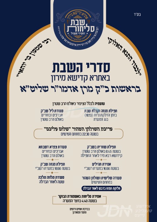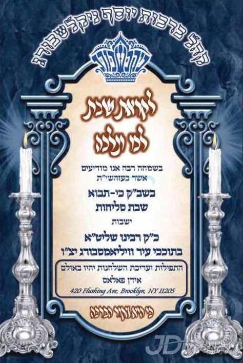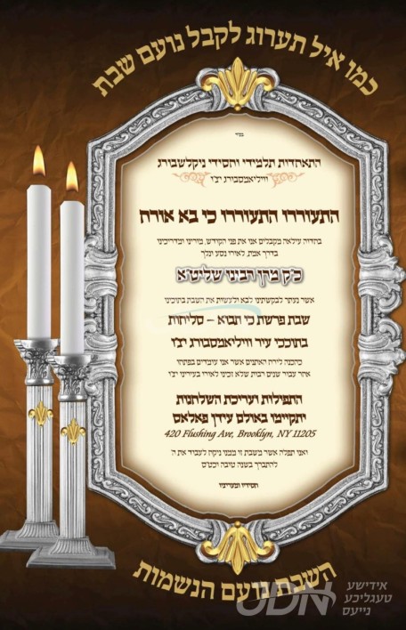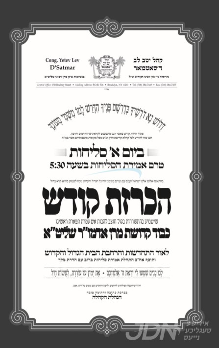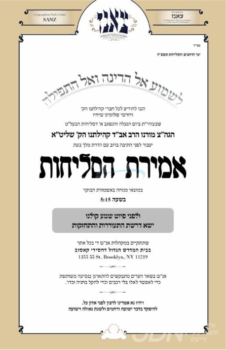 כ"ק אדמו"ר מטשערנאביל שליט"א וועט דעם מוצאי שבת זאגן סליחות ברוב עם הדרת מלך, אין היכל ביהמ"ד דחסידי בעלזא אויף די דריי און פערציגסטע סטריט אין בארא פארק.